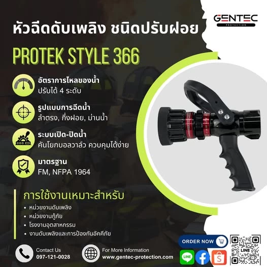 Protek Style 366 คือหัวฉีดดับเพลิงชนิดปรับฝอย (Selectable Gallonage) ที่ออกแบบมาเพื่อรับมือสถานการณ์วิกฤต ช่วยให้นักดับเพลิงควบคุมทิศทางและรูปแบบน้ำได้อย่างมีประสิทธิภาพสูงสุด