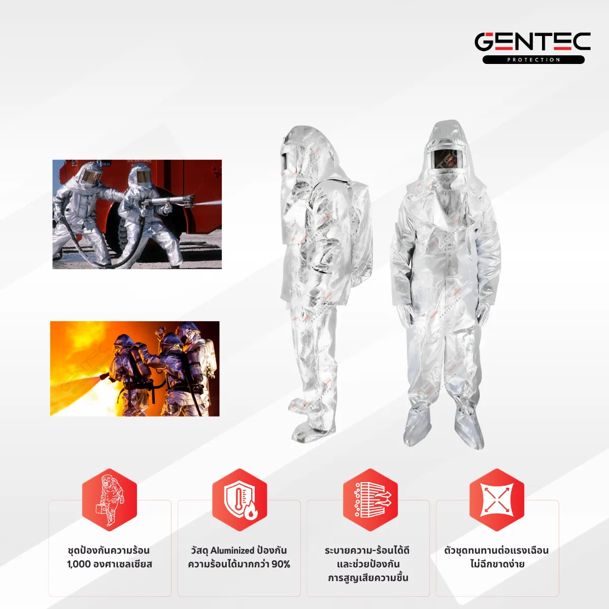 ชุดกันความร้อน (Aluminized Heat Protective Suit) ใช้สำหรับปกป้องผู้ปฏิบัติงานจาก รังสีความร้อน (Radiant Heat), เปลวไฟ (Flame) และ โลหะหลอมเหลว (Molten Metal Splash) เหมาะสำหรับงานที่ต้องอยู่ใกล้แหล่งความร้อนจัด เช่น